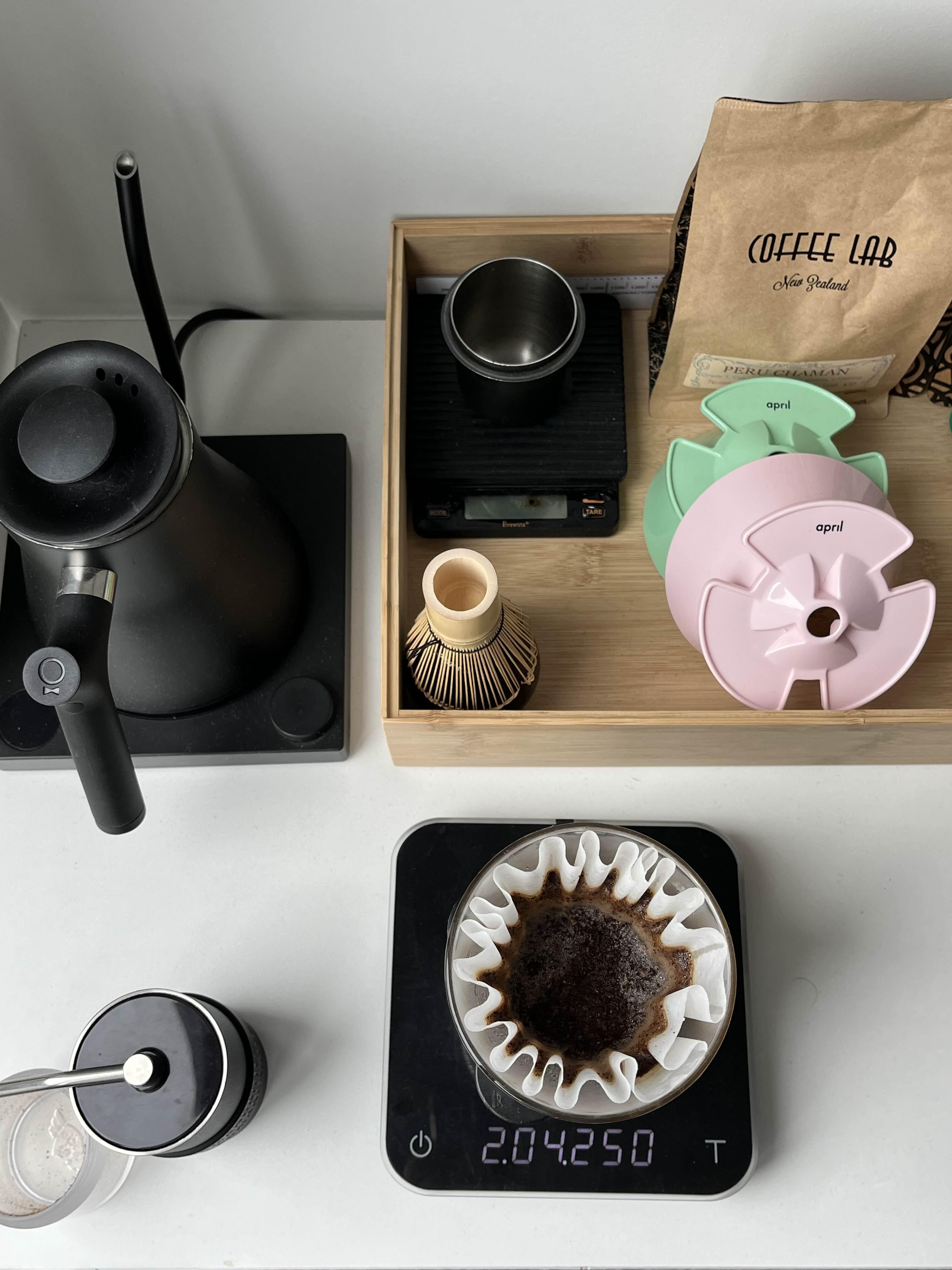 커피를 추출하면서 커피의 물 빠짐 속도가 빠른 편에 속했습니다. 원두는 15.3g을 사용했고 물 온도는 93도, 그라인딩 사이즈는 코만단테 24 클릭으로 진행했는데요. 드리퍼는 오레아 V3입니다.